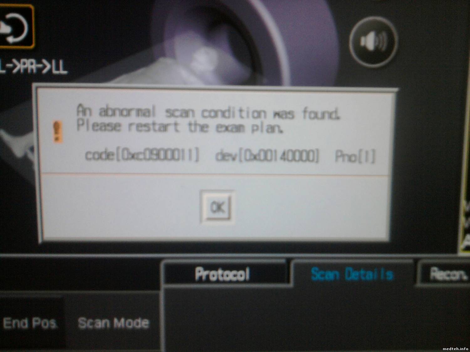 Через два дня аппарат включили и при начале загрузки системы появилась ошибка в желтом окне - RSYS CANNOT RUN, после полной загрузки не появилось меню сканирования, меню ввода данных пациента, показатели базы данных сканирования - все по нулям, warmup сделать невозможно...После проверки параметров сканирования и тестирования винта, было проведено форматирование и конфигурация блока RDD, перезагрузили аппарат - ничего не изменилось, все тот же RSYS CANNOT RUN... Перезагрузили еще несколько раз - результат тот же. Через день включили аппарат - ошибки нет, грузиться нормально появились все меню, трубка прогревается без проблем, но при любой попытке начать сканирование или любую калибровку, в тот момент когда должен начаться процесс - выскакивает ошибка AN ABNORMAL SCAN CONDITION в сером окне. Ресторнули бекап, перезагрузили машину - опять появилась RSYS CANNOT RUN, которую в этот раз убрали элементарно - опцией inizializing image only, сейчас машина загружается нормально, дает сделать warmup, но при попытке сделать любой вариант калибровки или сканирования - все тот же AN ABNORMAL SCAN CONDITION в сером окне. Может быть кто-нибудь уже сталкивался с такой проблемой ?