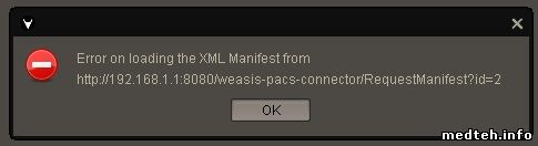 2 - при попытке открыть картинки виазисом , запускается ява потом виазис а потом ошибка "error on loading the xml manifest from http://192.168.1.1:8080/weasis-pacs-connector/RecuestManifest?id=2"