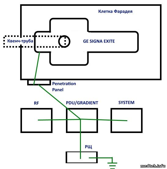 В документации GE не нашёл информации по тому как заземлить квенч-трубу и должен ли быть эл. контакт с корпусом магнита или клеткой Фарадея.