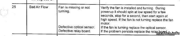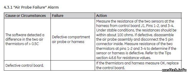 The software detected a difference in the two air thermistors of >0.5C Программное обеспечение обнаружело разницу в двух воздушных термисторах >0.5C Defective compartment air air probe or harness Неисправные отсек воздушного датчика воздуха или жгута. Measure the resistance of the two sensors at the harness from control board J1, Pins 1-2, and 3-4. Under stable conditions, the resistance should be within about 100 ohms(Опечатка! надо:10000 Ом). If defective, disassemble the air probe assembly and disconnect the 5 pin connector inside. Measure resistance of the two thermistors at pins1-2 and 3-4 to determine if the sensor or harness is defective. Refer to the Tips section 4.6.6 for resistanse values. Измерьте сопротивление двух датчиков через провода от пульта управления J1, контакты 1-2 и 3-4. При стабильных условиях, сопротивление должно быть в пределах 100 Ом(Опечатка! надо:10000 Ом). Если дефектно, разобрать узел зонда воздуха и отсоединить 5 контактный разъем внутри. Измерьте сопротивление двух термисторов на контактах 1-2 и 3-4, чтобы определить,датчик или жгут неисправен. См. раздел 4.6.6 Советы по значениям сопротивлений.