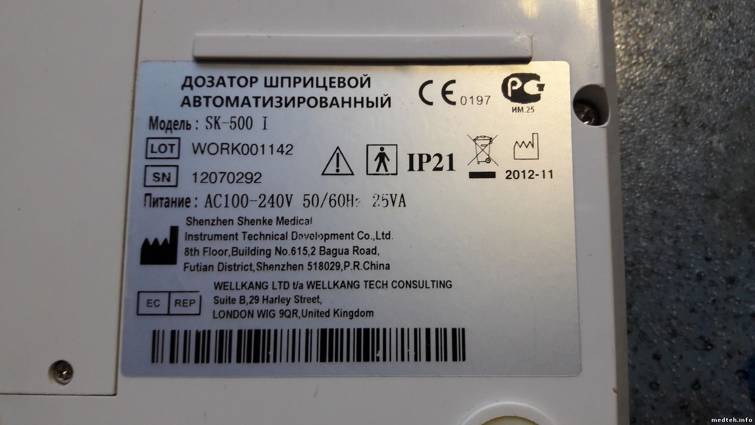 Дозатор шприцевой инфузионный SK, варианты исполнения (модели): SK-500I, SK-500II, SK-500IIB, SK-500III. II. Производитель - Shenzhen Shenke Medical Instrument Technical Development Co., Ltd., (Шэньчжэнь Шенке Медикал Инструмент Техникал Девелопмент Ко., Лтд.), Китай.