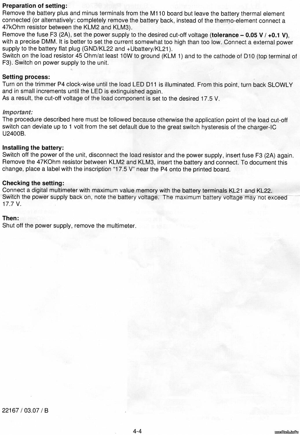 vf, Стоит там U2400B. И даже если нет под руками самого аппарата, можно было и попдробней эту ветку изучить. valius, приложил сканкопию сопровождавшего новую АКБ документа по регулировке, в котором описана полная методика, и упоминается сия микросхема. Единственный недостаток представленной инструкции, это использование нагрузочного резистора, заведомо известного номинала, для иммитации АКБ. Но как правило, внутреннее сопротивление АКБ (отличной от оригинала) не известно, то приходится использовать эмпирический метод.