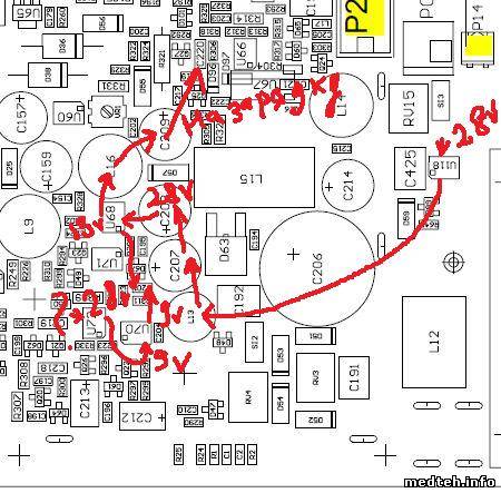 в сервисе есть схема, и по ней получается, что с трансформатора идёт на диодный мост, а потом на катушку l13 без всяких встраений, но на самом делене так. На фото катушка l13 и рядом с ней дорожка и точка куда она уходит. Вот куда от диодного моста идёт дальше от этой точки? Найти не могу.