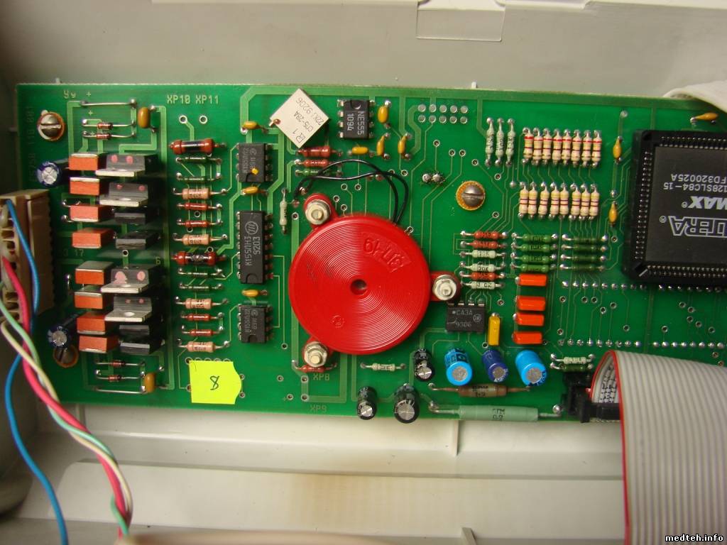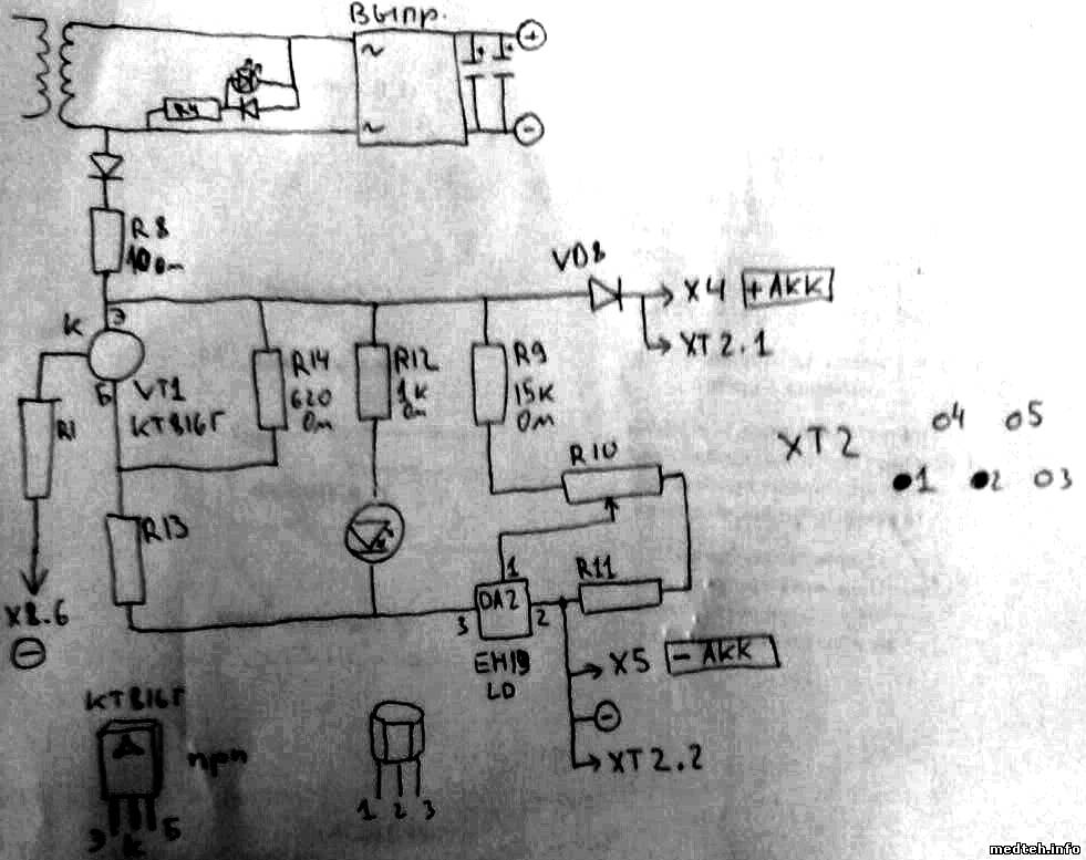 P.S. HELLp!!! Теперь нужна только схема блока питания ДШ-07!!!! Проблемма вкратце: Есть ЧЕТЫРЕ шприцевых насоса ДШ-07 1 двигателя исправны у всех, 2 блоки управления тоже исправны у всех, 3 датчик размера шприца только у двух, у одного показывает 50 мл даже при пустом держателе (но с этим позже разберёмся); 4 аккумуляторы сдохли безвозвратно (уже заказл, но будут не скоро) 5 Главное: Первый блок питания включается,выдаёт на клеммы аккумулятора 10 Вольт, при включении мотора напряжение проседает до 8. Но таких напряжений не хватит для поддержания кислотного аккумулятора в заряженном состоянии!!! Второй блок питания включается,выдаёт на клеммы аккумулятора 6-7 Вольт, при включении мотора выдается тревожный звуковой сигнал и мигает светодиод со значком батареи. Третий блок питания не работал. Была вырвна выпрямительная сборка после трансформатора, её место очень потемнелое от перегрева, подвесил на проводах подобную - не помогло... Обнаружил обрыв в перичной обмотке трансформатора. Первичная обмотка - двойная (видимо для 120 Вольтовых сетей используют обе). Поэтому, если сгорела одна - подключи вторую! подключил и.... третий блок стал вточности как второй!!!! Четвёртый блок питания не работал. Сильно гудит трансформатор. Выгорела выпрямительная сборка после трансформатора, её место очень потемнелое от перегрева(ещё сильно потемнелаплата под диодом VD9), подвесил на проводах выпрямительный мост и блок стал как второй - выдаёт на зарядку около 6В