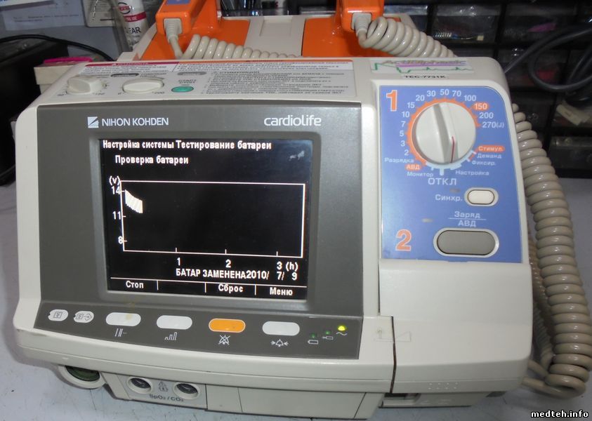 у этого дефибрилятора есть собственный тест батареи через сервисный режим, там же написана дата установки батареи (ровно через год он будет ругаться и просить тест)