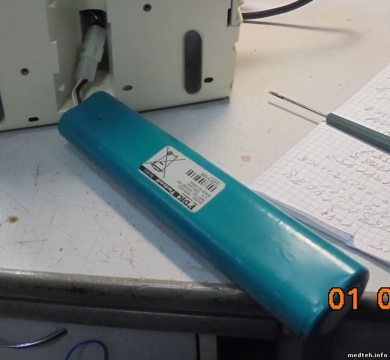 ... ещё вопрос по аккумулятору (фотки прилагаю). Китайский Ni-MH ?, напряжение полностью заряженного 14V. Измеряю без сети при заряде 300Дж - практически не просаживается (0,2-0,4V). То что "китаец" - терпимо, но по моему разумению, дефибрилляторы должны никель-кадмиевыми снаряжаться, они морозостойче.