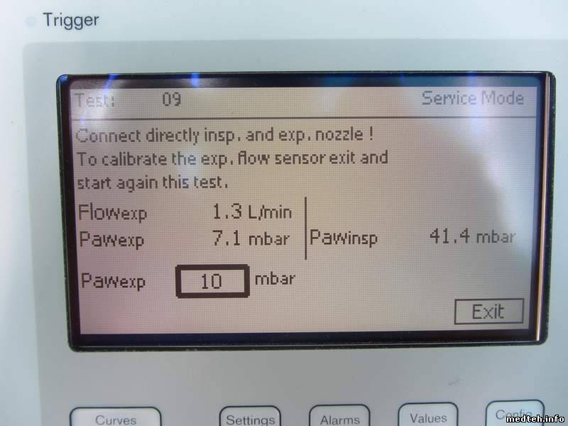 2. В сервисном режиме тест № 7 (Check pressure source and inspiration flow sensor) вроде прошел нормально. 3. А вот в тесте № 9 (Check expiration valve) обнаружено занижение параметра Pawexp . Expiration valve – это внешний клапан выдоха? Он был заменен, но ошибка «!!! Измер. Давл. Неисправно» осталась.