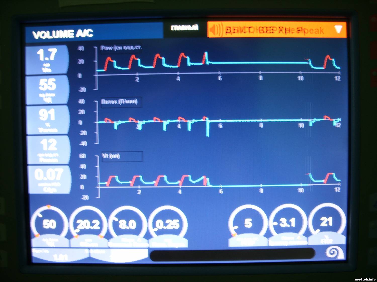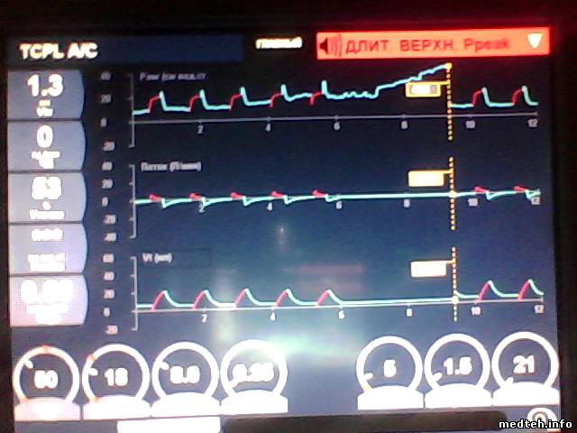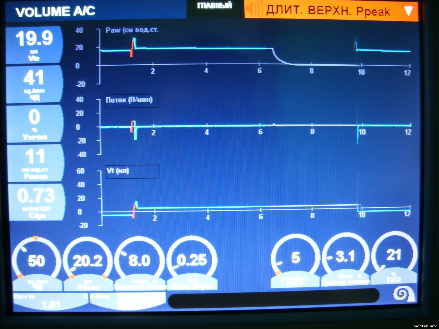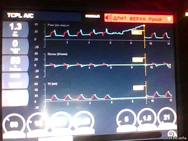 Мнегое непонятно. Во первых какие режимы выставлены. На фотографии это понять ложно. Главное: взрослый, детский или новорожденный. Судя по TCPLV A\C режим для новорожденных. Какое искуственное легкое применяли? Ибо объем легких у взрослого, ребенка и новорожденного сильно отличаются. Следовательно искуственное легкое должно соответствовать режиму.