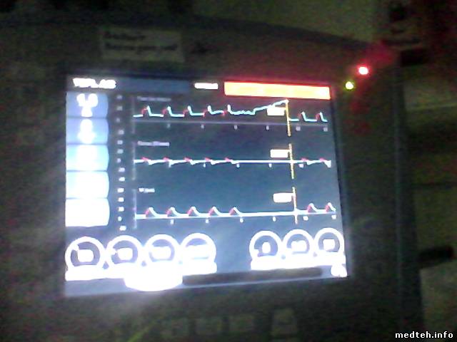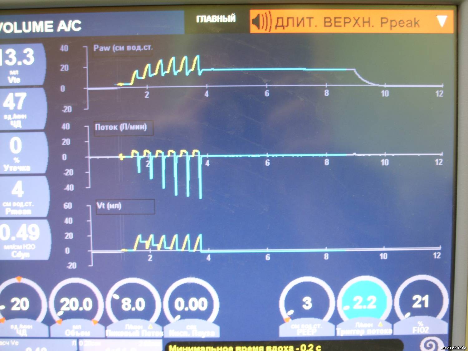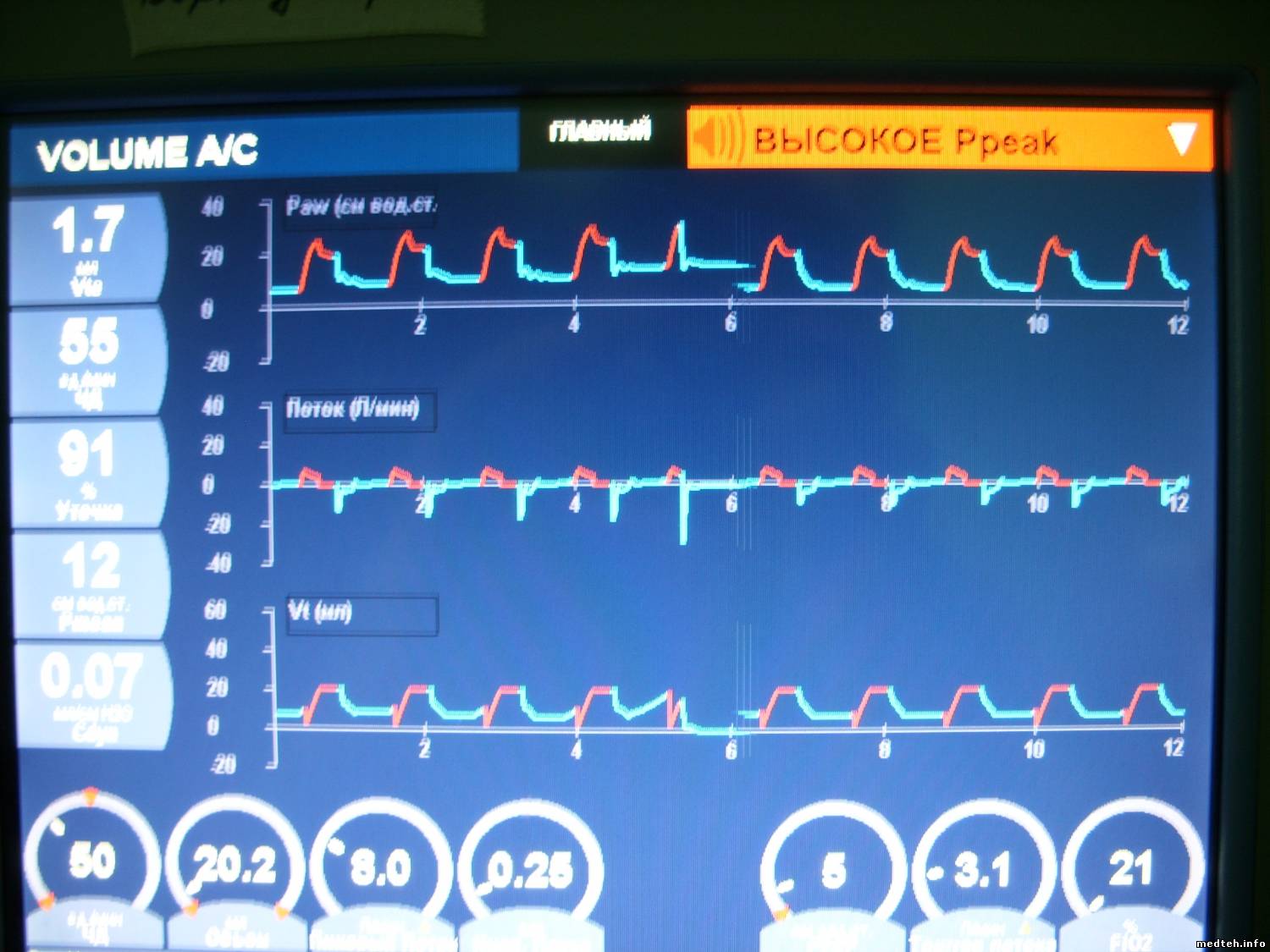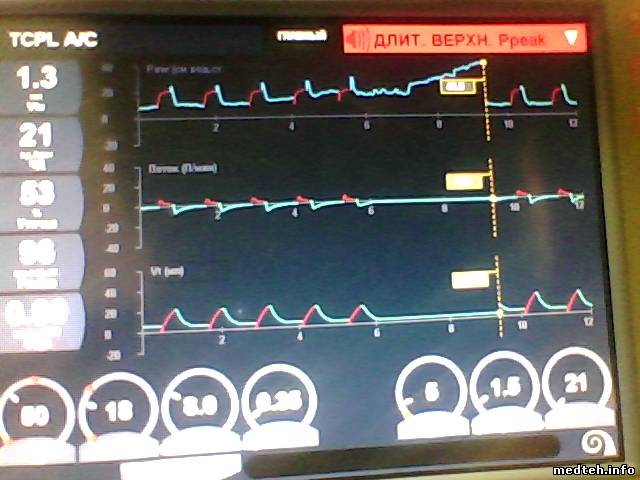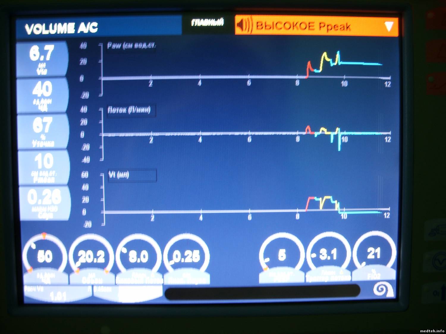 Мнегое непонятно. Во первых какие режимы выставлены. На фотографии это понять ложно. Главное: взрослый, детский или новорожденный. Судя по TCPLV A\C режим для новорожденных. Какое искуственное легкое применяли? Ибо объем легких у взрослого, ребенка и новорожденного сильно отличаются. Следовательно искуственное легкое должно соответствовать режиму.