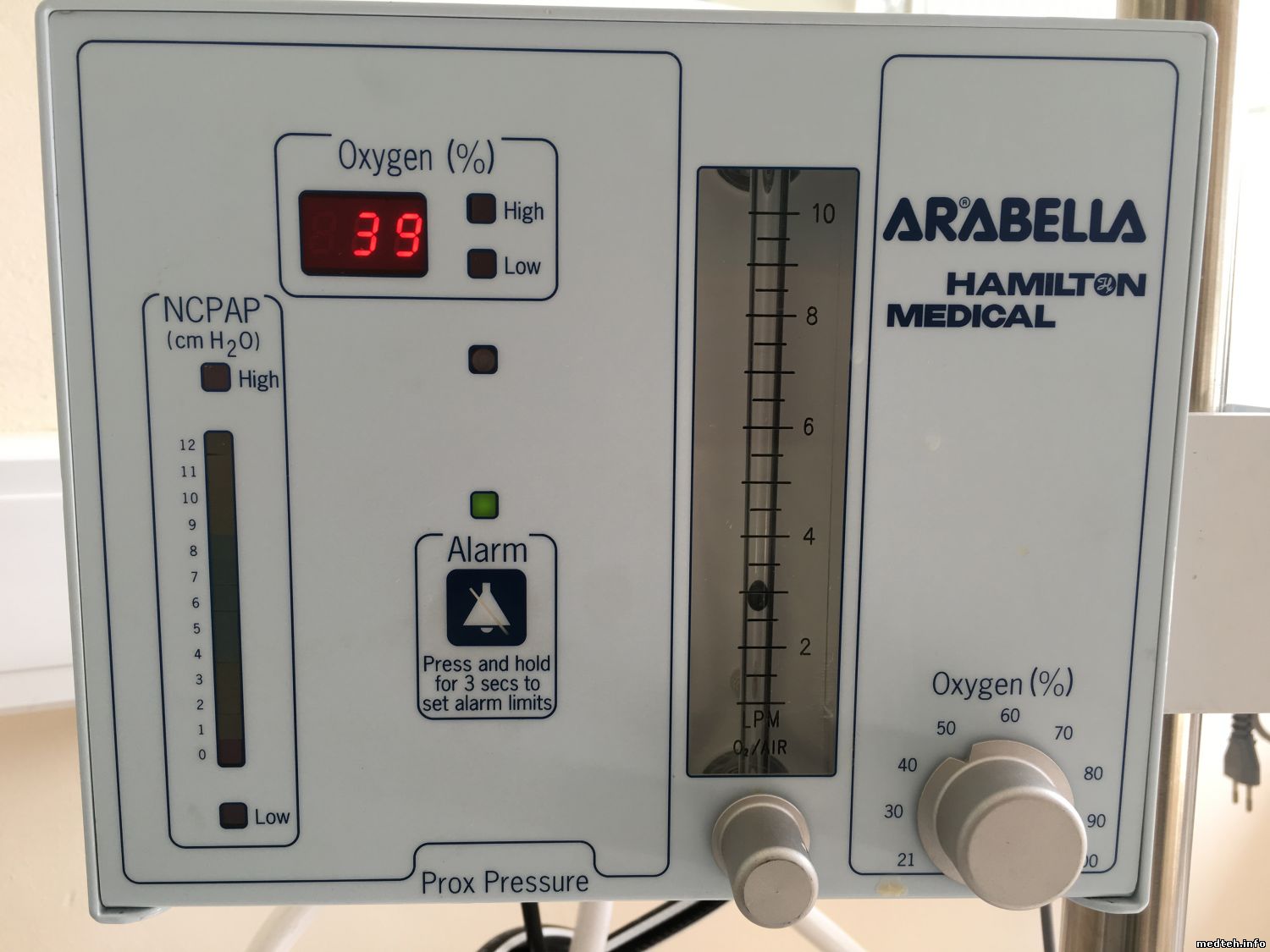 Аппарат ИВЛ (аппарат активного СPAP) Arabella, компании Hamilton Medical AG, Швейцария. Это назальная система, предназначенная для поддержки самостоятельного дыхания, обеспечивает безопасную, эффективную подачу носового постоянного положительного давления (NCPAP) новорожденным, в том числе новорожденным с очень низким (малым) весом при рождении.