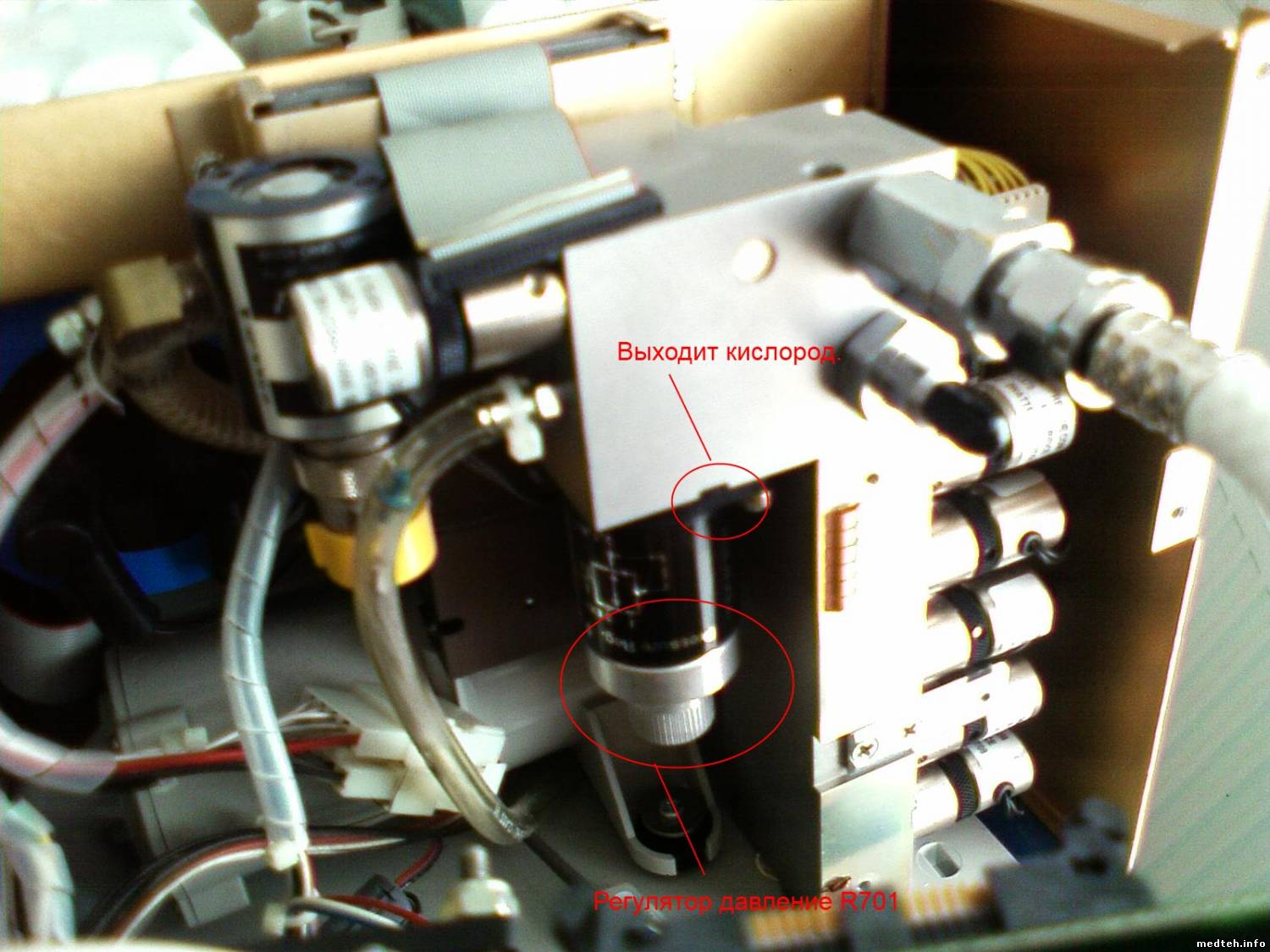 Доброго времени суток. Собственно, подключаем кислородный шланг, включаем аппарат и внутри аппарата "выходит" кислород (на картинке показано (качество не очень конечно, но как телефон смог снять), регулятор давления R701). Может кто сталкивался с данной проблемой. Включил второй такой же аппарат, все тихо и спокойно работает. Не хотелось бы в дебри лезть, кто что посоветует? Заранее благодарен.