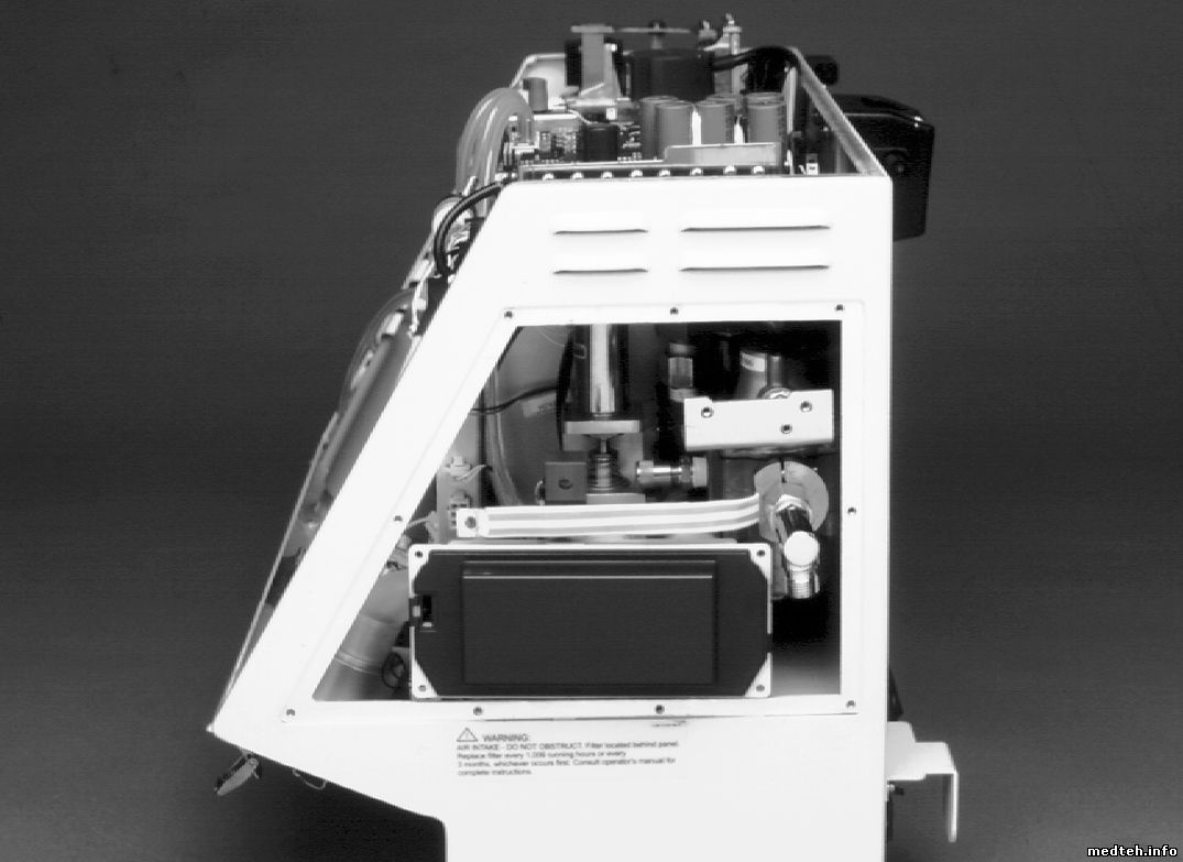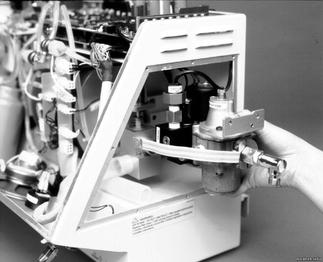 В аппарате 760 серии нет компрессора, в обычном понимании. Там есть цилиндр и поршень, которые создают давление в дыхательном контуре. Но компрессор в аппарате есть. Это насос PEEP. Реально это компрессор вибрационного типа. Кстати мне приходилось сталкиваться что не проходил тест герметичности из-за этого насоса PEEP. Правда при этом не проходил еще и тест системы PEEP. Кстати, насос PEEP должен заменяться через каждые 15000 часов. Но нарушение герметичности может быть по многим причинам, например, из-за неисправности проверочного клапана выхода цилиндра.