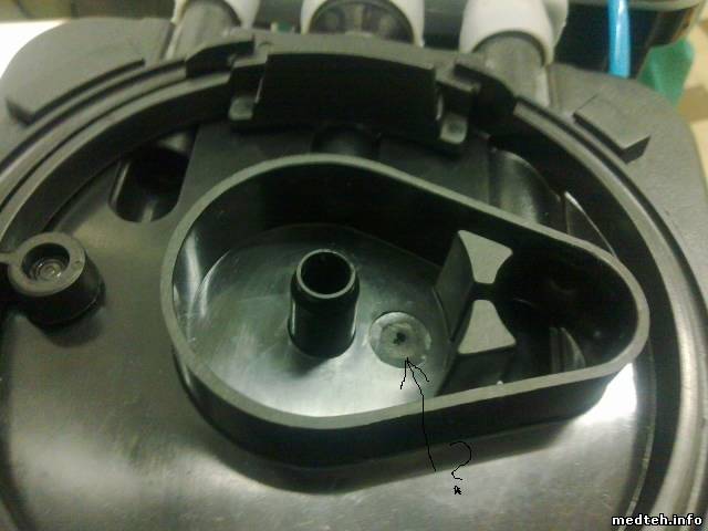 В феврале получили Foton из ремонта, что именно сделали с аппаратом - не знаю, как будто что-то "отломали", но эта информация через третьи руки и верить ей очень сложно. Пока на аппарате не работали, т.к. в данном учреждении нет еще и компрессора. Проверяли работу на кислороде - PEEP стал почти нулевым (2-3). При снятия меха возникло впечатление, что что-то отломали под силикованным клапаном на основании блока меха (показано стрелкой на рисунке). К сожалению, за давностью не помню как там было ранее, а на предыдущих снимках основание меха сфотографировано с клапаном (показано в одном из моих ранних сообщений). Сложилось так же впечатление, что стало сложнее устанавливать ДО. С уважением, Mik.