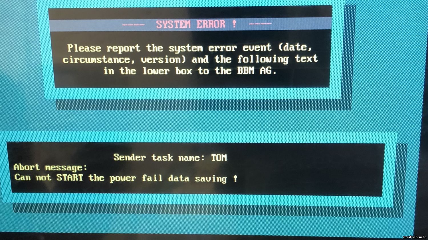 Здравствуйте! Произошла ошибка, текст ошибки "Can not start the power fail data saving". Что произошло: Включили аппарат--запустили тест--тест прошел без ошибок--только начали подключать пациента и вылезла данная ошибка, после этого при каждым включением вылезает ошибка. Если кто сталкивался с данной проблемой прошу помочь.