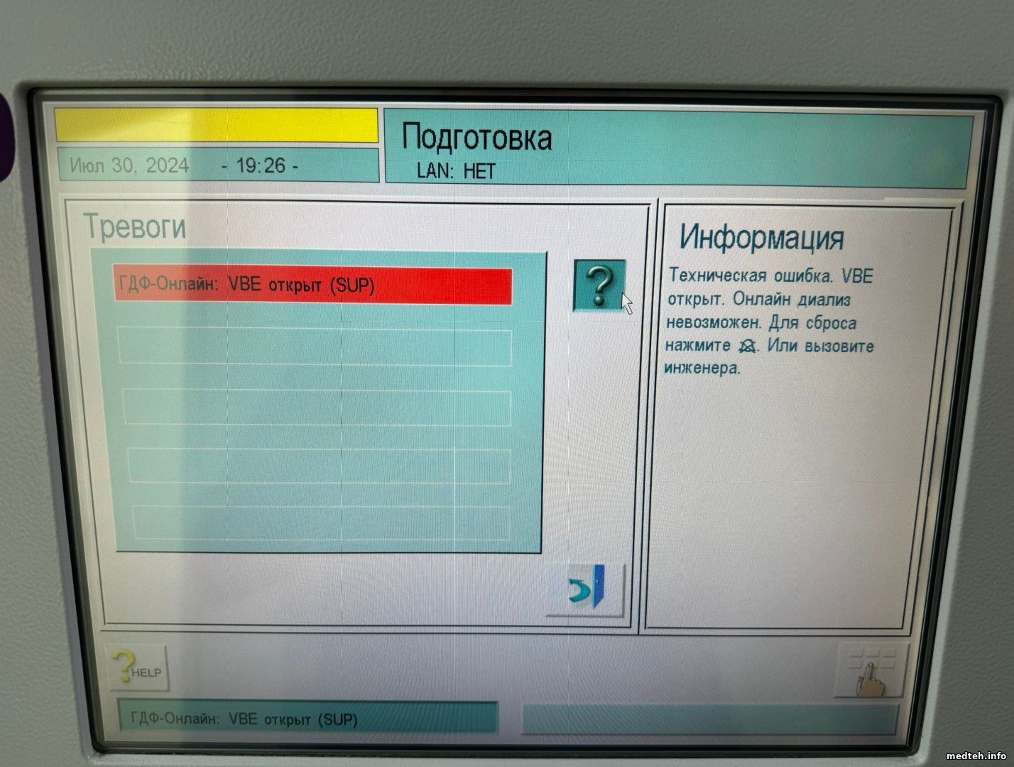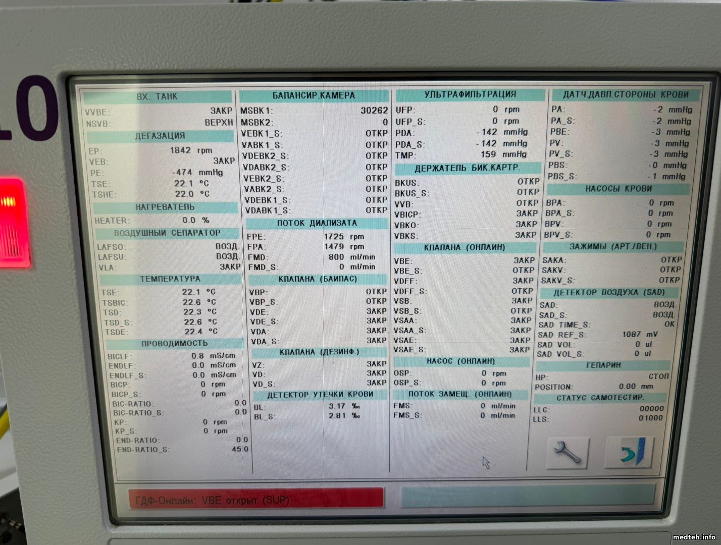 Слушайте, хотел ещё спросить: у нас есть ещё аппарат, но он вообще мёртвый, как будто инсульт получил, постоянно при включении в подготовку, пишет, что клапан vbe открыт и диализ не возможен. И что довольно странно, показывает, что крутятся моторы, хотя этого не происходит и даже в инженерном меню, на клапан этот питания нет, уже измеряли ... Можете ли что-то посоветовать?