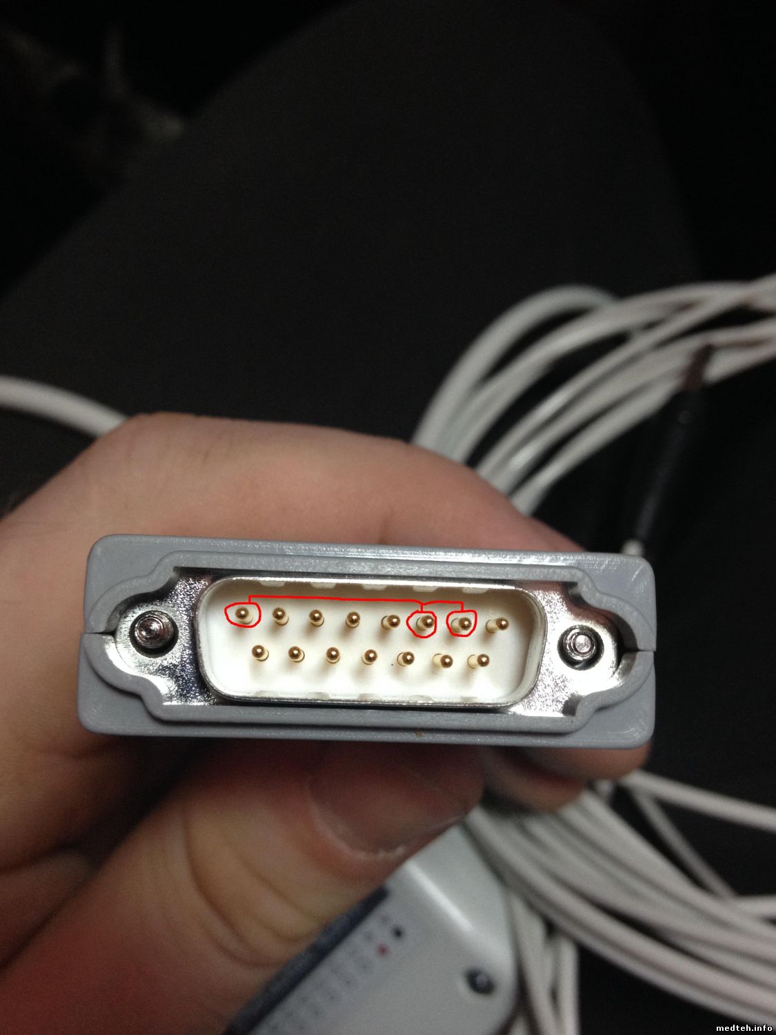 Здравствуйте коллеги! Такая проблема с данным кардиографом: на отведении V2 наблюдается очень маленькая амплитуда по сравнению с другими. Первым делом стал проверять кабель пациента и натолкнулся на то что в разъеме прозваниваются сразу три контакта с электродом С2 ( отметил на фото). Разобрал распределительную коробку и нашел что звонится экран и жила С2 из-за того что на плате сквозной пропай между экраном с одной стороны и проводом с другой. Это нормально или это заводской брак?