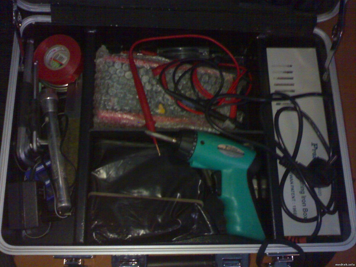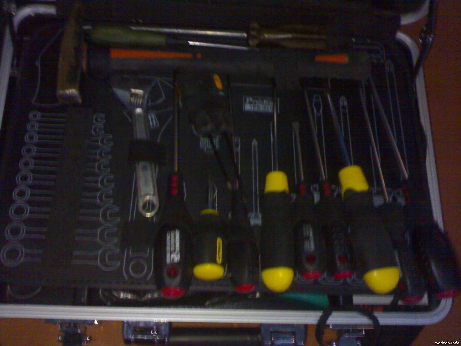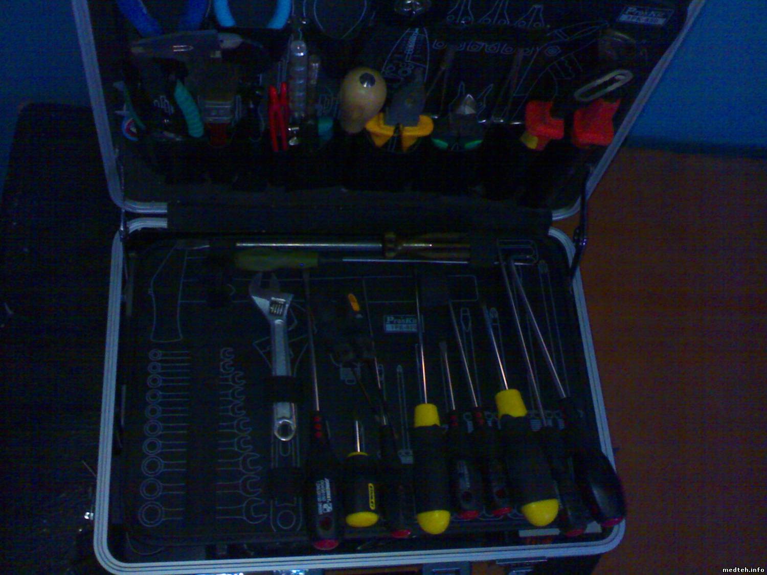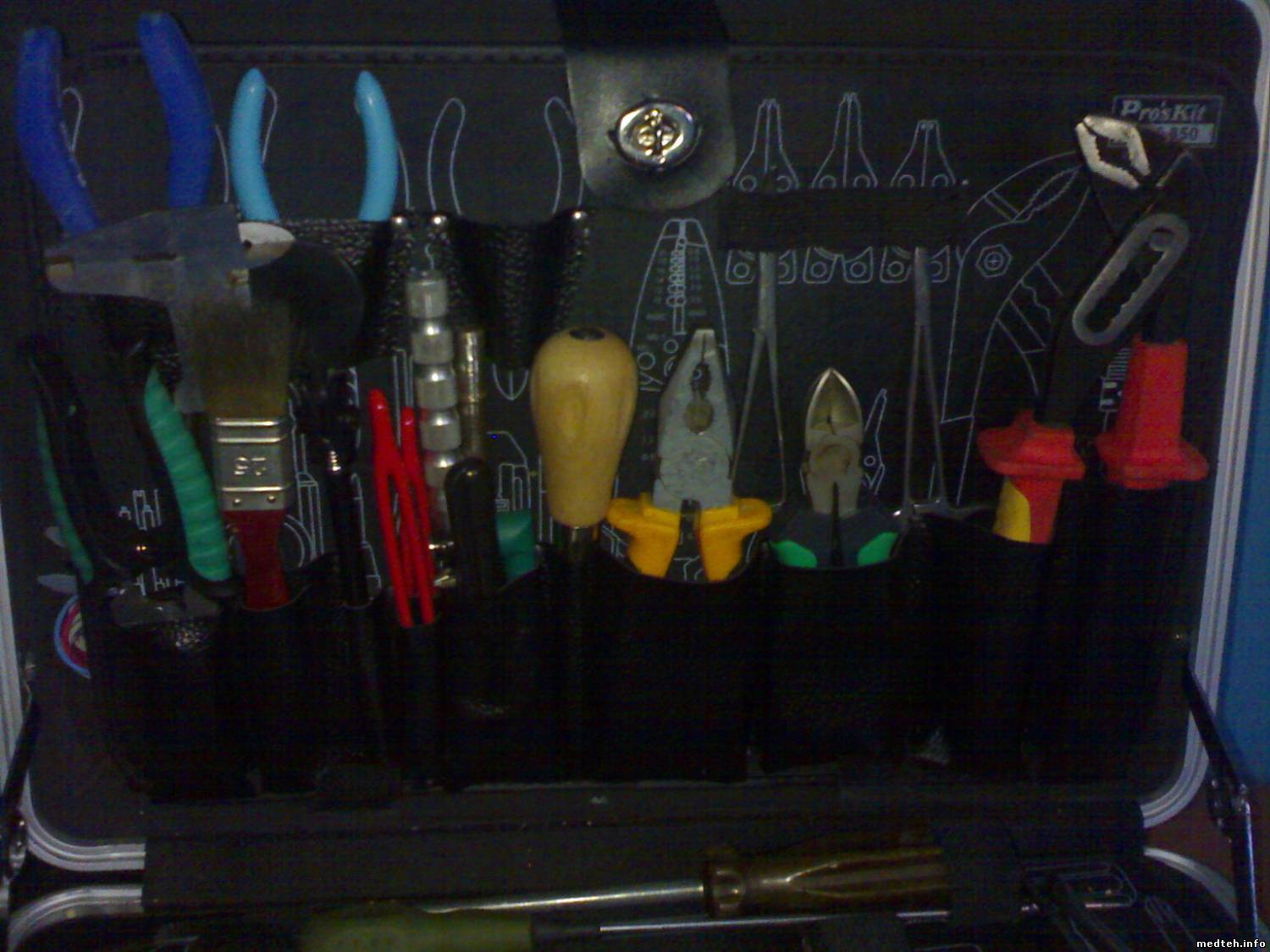 В это (вес килограмм 15) все и упирается. Больничка трех-пятиэтажная и кабинеты ,по закону подлости, находятся далеко друг от друга. Вспотеть можно только таская инструмент, на работу и сил не останется. На практике постоянно использую минимальный набор - тестер, набор отверток(штук пять), паяльник (святое дело), инструмент для пайки (кусачки, пинцет, нож, ножницы). плоскогубцы, набор(небольшой) проводов и кое что из мелочевки. Этого хватает чтобы выполнить простейшую диагностику, и устранить неисправности. Процентов 80 неисправностей в физиотерапии, да и у многих других, простейшие: - обрывы проводов, замыкания, срабатывание защиты и пр. На месте из ремонтов выполняю только то, что не требует разборки прибора (извлечение из корпуса не в счет), все остальное - или на стационаре, или при последующем посещении, когда набираю под конкретную работу и инструмент и материалы.