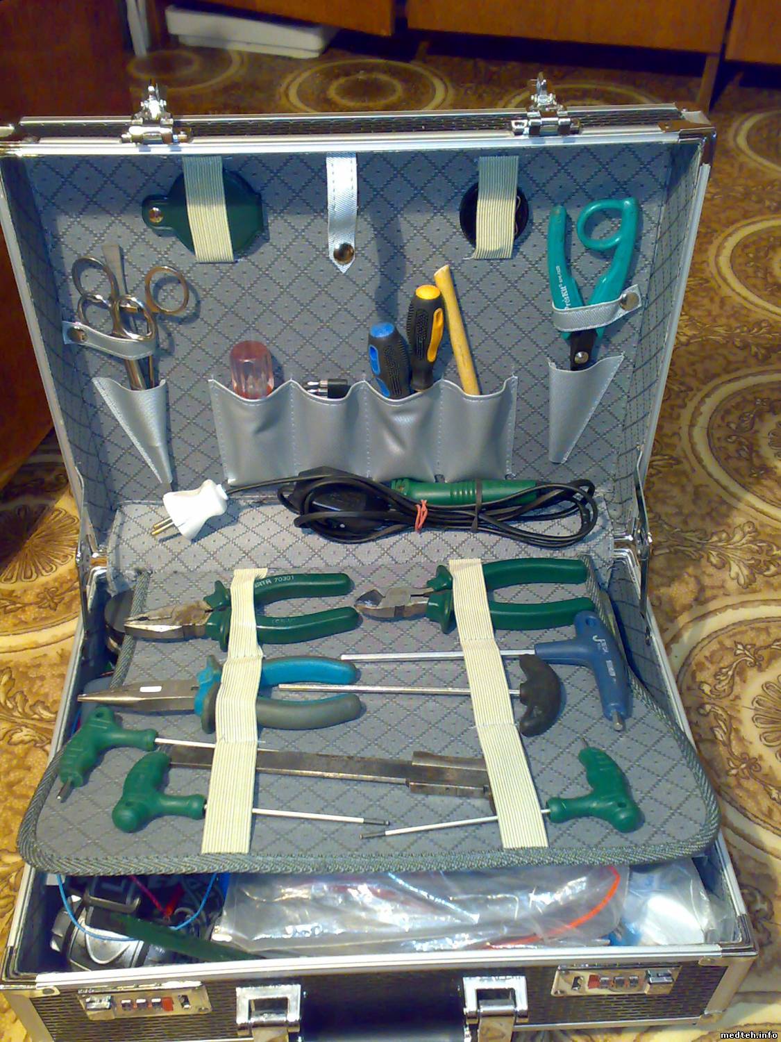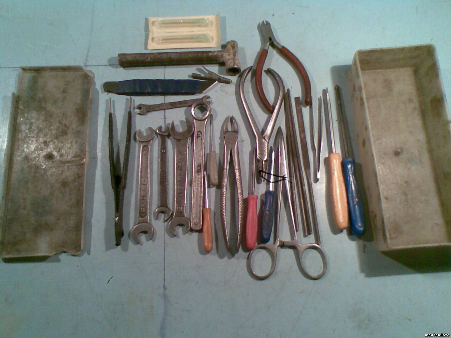 Sept, Cогласись что у меня почти то-же самое. Раздвижные плоски берут от М3 до крана 1/2. Ключик с самозахватом вообще универсальный. Иногда плосками держу а ключем кручу. Прибор у меня поменьше и полегче. Остальное (пинцеты/захваты и иголки) можно найти в больничке.