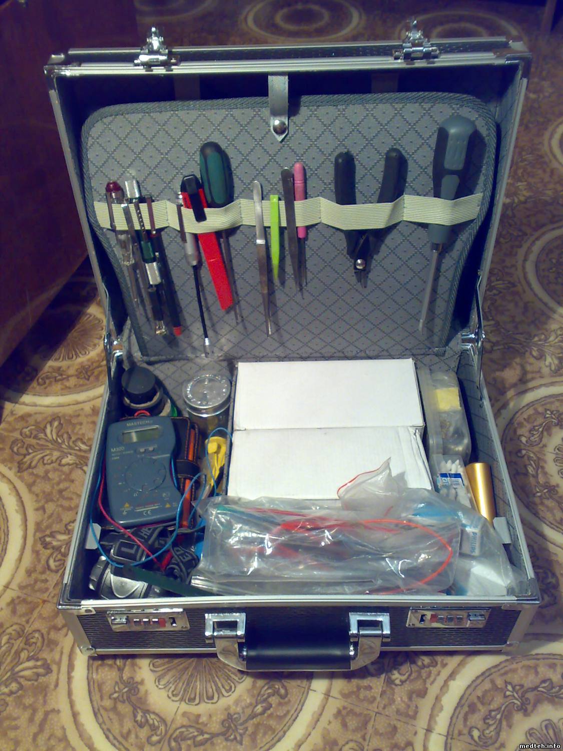 Универсальный инструмент для каждого дня (8кг) +Для ремонта автоклавов и станков для обработки линз и другой "тяжёлой" техники (15кг) +Сокваяж для работы с кабелями, проводами (инструмент для опрессовки наконечников разделки, кабель тестер, наконечники, клемы (6кг) + Перфоратор с набором буров (10кг) + Электродрель с набором сверл (8кг) +Фен строительный + Две коробки из под ксеросной бумаги с разными запчастями в более мелких коробочках (6кг) +Пластиковая картотека с электронными компонентами (2кг) + Пластиковая картотека с крепежом (8кг) + Набор бит и торцовых головок(3кг) +Пакет трубок (0.5кг) +Пакет проводов (4кг) +Коробка с сантехническими запчастями: краны, муфты, переходники(10кг) Сумка с химией и смазками+ баллончик с жатым воздухом (5кг) Кроме Универсального инструмента для каждого дня вес указан ориентировочно - никогда не заморачивался сколько это весит. Это всё легко умещается в багажнике авто.(каждая позиция имеет своё определённое место могу найти на ощупь ) В проекте специализированный чемоданчик для для диагностики и ремонта электроники Естественно кое что докладывается или удаляется в зависимости от задач Для путешествий пешком (самолётом, поездом или пароходам) - Универсальный инструмент для каждого дня (8кг) + портативный осциллограф (по необходимости) и набор запчастей под конкретную задачу.