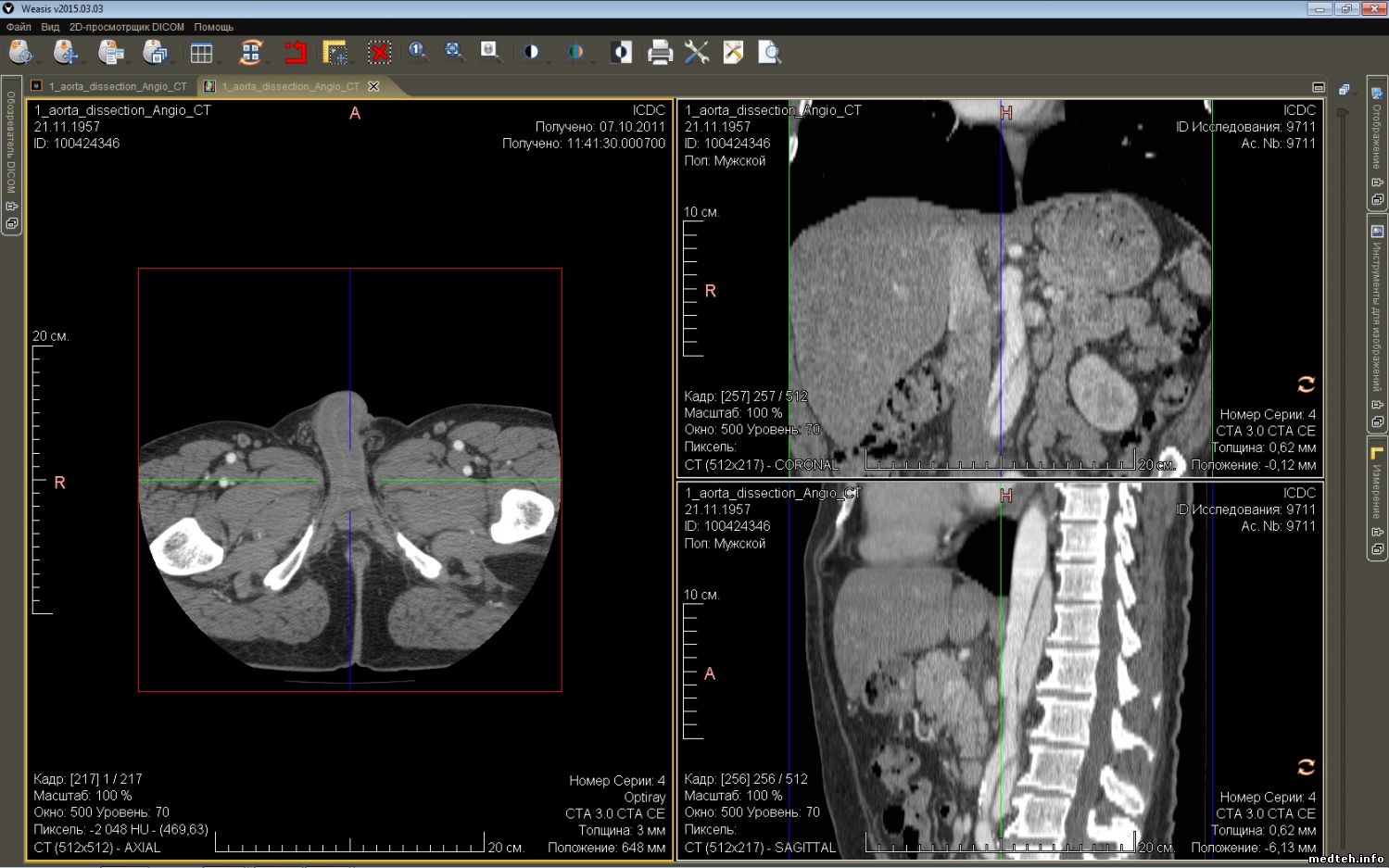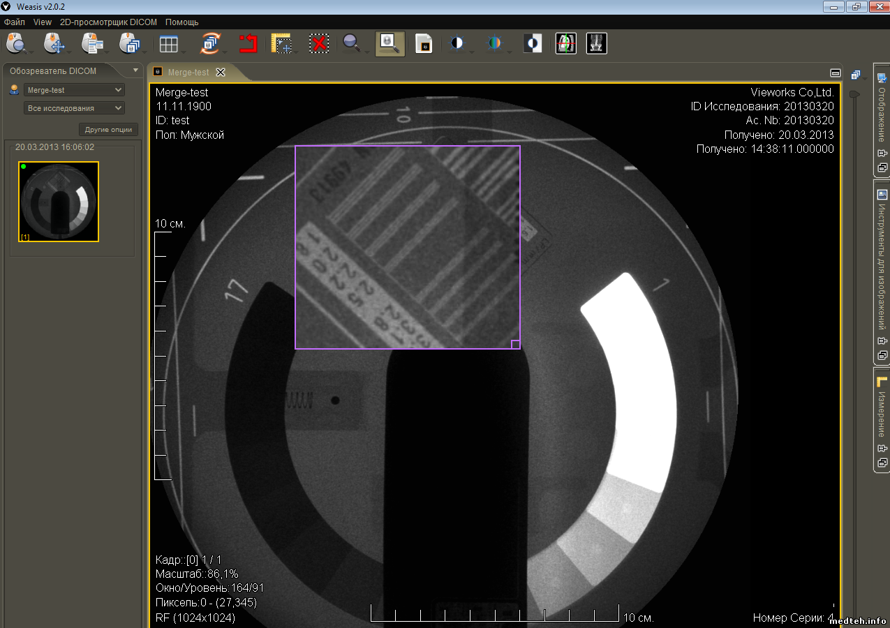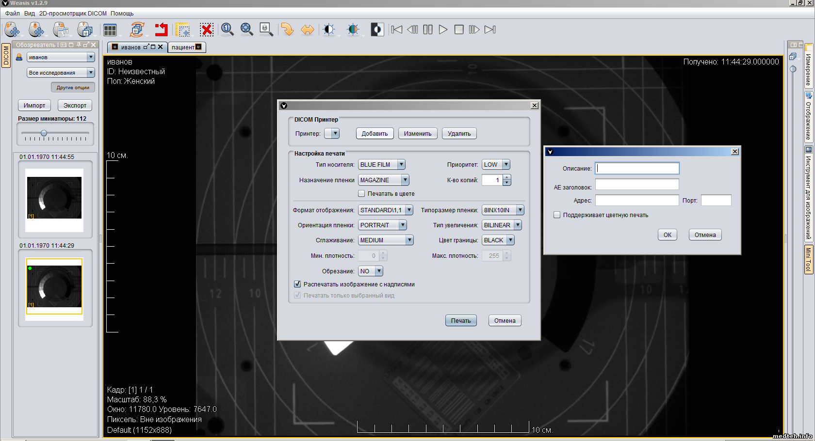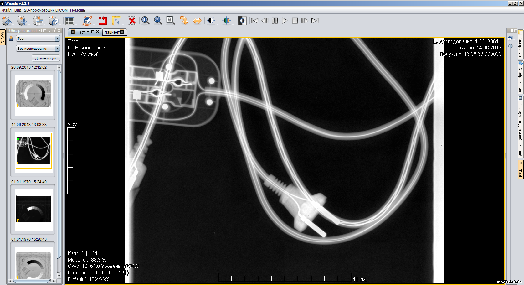 Первые впечатления: weasis работает достаточно шустро, как вьювер вполне хорош. Есть фкункция импорта из файла, но нет функции отправки на сервер. Интерфейс русифицирован. А вот русские буквы в тегах превращаются в бред и точно также отображаются в архиве.