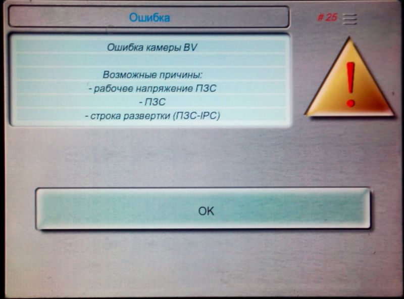 ошибка 0025 - BV camera error Possible causes : - CCD Operating voltage - CCD - Video line (CCD-IPC) Посмотрите блок В337 - с него через разъем Х335/1 на видеопроцессор IPC и камеру идут +-12В и +24В Все напряжения мониторится светодиодами. на плате - предохранители.